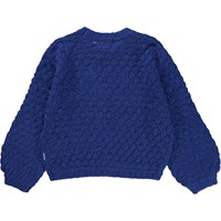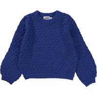 Blå popcornstickad tröja. Tröjan är tillverkad i en mjuk och lätt alpaca/ull blandning, har rund hals med ribbkant, långa ärmar med volym och ribbkant, ribbkant bid höften och en lös passform. Den perfekta vardagströjan.