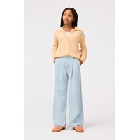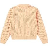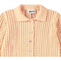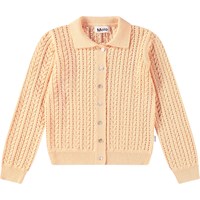 Ljusorange kofta i mjuk ekologisk bomull. Koftan har en normal passform, klassisk krage, ribbade kanter vid ärmslut och nertill samt pärlemorsknappar framtill. Koftan är stickad i ett vackert spetsmönster.