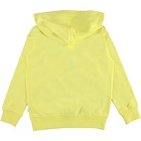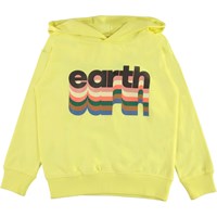Madelyn är en gul luvtröja med trycket 'Earth' i regnbågens färger ovanför bröstet.