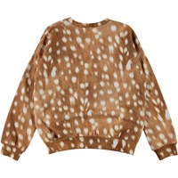 Maja är en brun tröja med vita fläckar, som ser ut som en rådjurspäls. Kombinera blusen med matchande byxor.