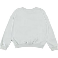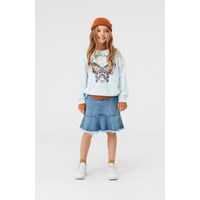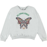 Maja är en ljusblå tröja med en vacker broderad fjäril på magen och texten "Flying free".