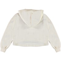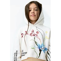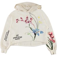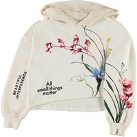 Malina är en ljus, kort hoodtröja med blommor och texten 'All small things matter' på tröjans nedre del. På ena ärmen står det 'Beautiful interference'. Kombinera tröjan med matchande byxor.