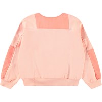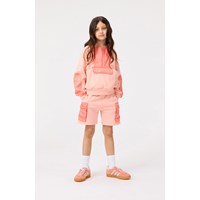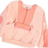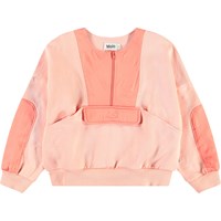 Ljusorange sweatshirt i mjuk bomull med muddar vid ärmsluten och nederkanten. Tröjan har en lös passform, dragkedja framtill på bröstet, en påsficka och en ficka med lock framtill. Tröjan är designad med två olika material som framhäver de vackra detaljerna. Kombinera tröjan med matchande byxor för en komplett uppsättning.