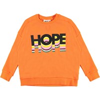 Mandy är en orange tröja med trycket "Hope" i regnbågens färger. Blusen har drop down axlar och ribbade kanter vid ärmar, urringning, samt vid tröjans slut.