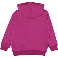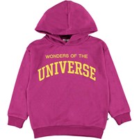 Manuela är en lila huvtröja med texten 'Wonders of the Universe' broderat i gult över bröstet.