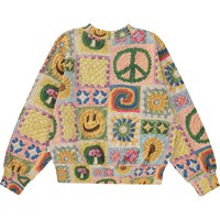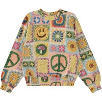 Multifärgad sweatshirt medvirkat mönster. Här har Molo själv varit igång och virkat för att skapa vår egen tolkning på den populära trenden. Man kan hitta regnbågar, smileys, svampar, solrosor och peacetecken. En uppmaning att själv leta fram virknålen och skapa egna mönster och släppa loss fantasin. Denna tröja är tillverkad i 100% bomull, har en rund hals med ribbkant, ribbkant vid ärmar och höfter och en normal passform. Matcha ev. tröjan med byxorna, Adan, i samma mönster, för ett coolt set.