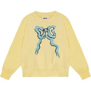 Ljusgul sweatshirt i ekologisk bomull med en rund hals och ribbstickad kant vid halsen, nederkanten och ärmarna. Sweatshirten har en oversize-passform och på framsidan finns en ljusblåa paljetter i form av en stor rosett, vilket ger en elegant touch till blusen.