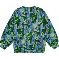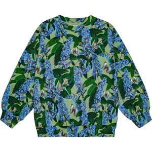 Grön sweatshirt i mjuk ekologisk bomull med rund hals och ribbstickade muddar vid ärmar, hals och nederkant. Med en lös passform är den enkel att ta på och bekväm att ha på. Trycket är ett over-all tryck av blå-lila fjärilsbuskar med flygande fjärilar i vackra färger. Kombinera den med matchande byxor för att skapa ett komplett och bekvämt jersey-set.