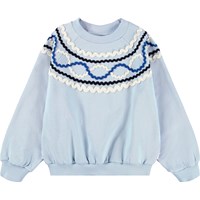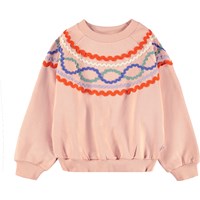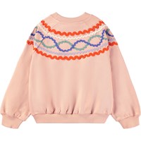 Rosasweatshirt i ekologisk bomull med ett färgglatt mönster av påsydda band. Denna sweatshirt har en rund halsringning, raglanärmar och ribbade kanter runt ärmarna och midjan.