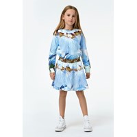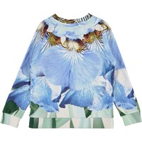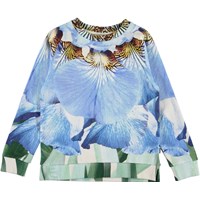 Marina är en tröja med stora blå blomblad. Tröjan har en ribbad kanter och små slitsar på sidorna. Kombinera tröjan med matchande kjol.