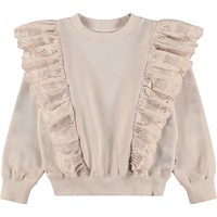 Beige batikfärgad sweatshirt i mjuk, ekologisk bomull med ribbade kanter vid hals, ärmar och nederkant. Sweatshirten har en vanlig och avslappnad passform med en elegant volangkant i broderie anglaise.
