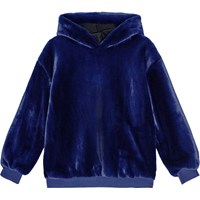 Exklusiv mörkblå fuskpälströja med huva, rund hals och muddar vid hals och midja. Tröjan är mjuk, varm och har en lös passform, perfekt för att bära med en långärmad T-shirt på kalla dagar.