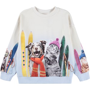 Ljusblå sweatshirt i ekologisk bomull. Sweatshirten har en lös passform, en rund halsringning, ribbade kanter och ett mönster av djur på en skidresa.