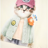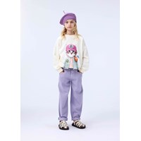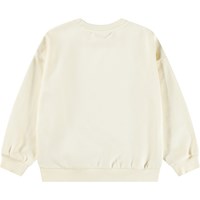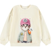 Off-white sweatshirt i ekologisk bomull. Sweatshirten har en lös passform, en rund halsringning, ribbade kanter och ett mönster av en söt katt klädd i kläder.