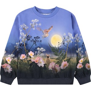 Blå sweatshirt i ekologisk bomull. Sweatshirten har en lös passform, en rund halsringning, ribbade kanter och ett mönster av vilda djur i månskenet.