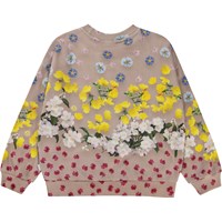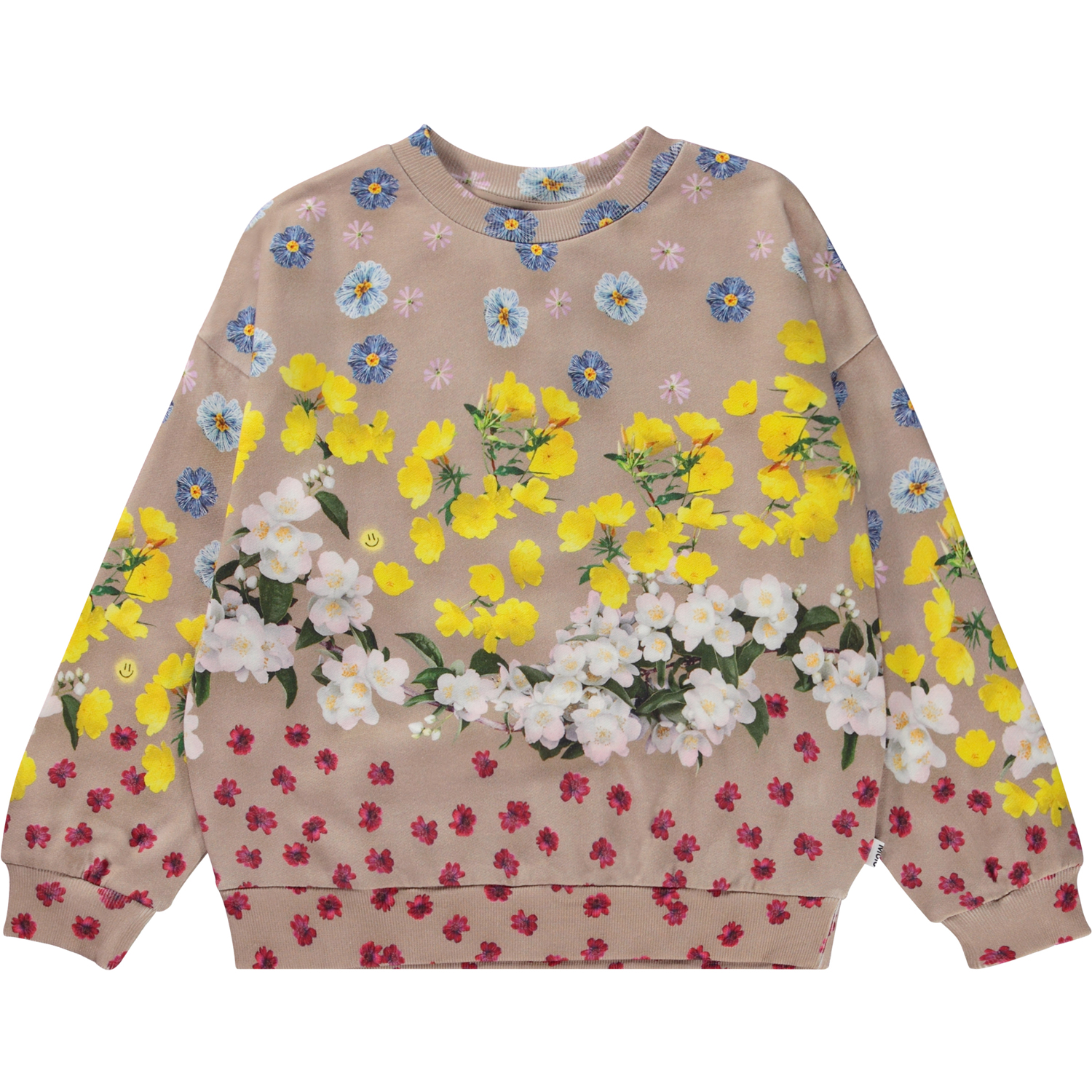 Beige sweatshirt med blommigt mönster. Här ses olika blommor med namn som Nattskugga och änglatrumpet. Speciellt för dessa är att de inte blommar på dagen, som andra blommor, utan på natten. Här badar de i månens sken och viker ut sina blad, allt medan vi andra sover. Denna tröja är tillverkad i 100% bomull, har rund hals med ribbkant, ribbkanter vid ärmar och höfter och en lös passform. Matcha ev. tröjan med byxorna, Amina, i samma mönster, för en cool look.