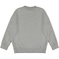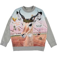 Maxi är en grå sweatshirt med roliga djur som sportar. Tröjan har hängande axlar och ribbade kanter.