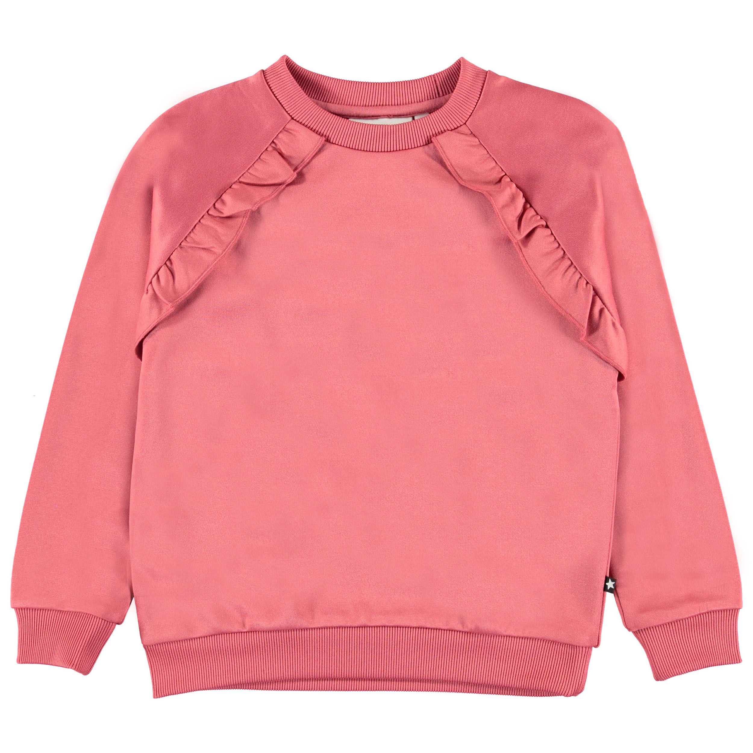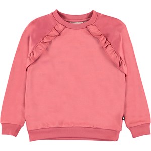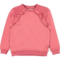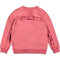 Michaela är en rosa sweatshirt med raglanärmar och volangkant. Kombinera sweatshirten med matchande byxor.