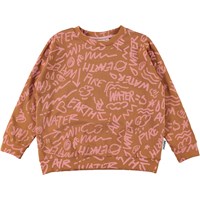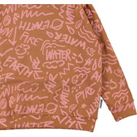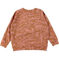 Mika är en brun tröja med ett tryck av grafiska symboler av de fyra elementen i rosa.