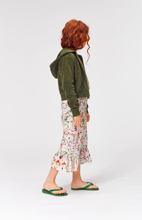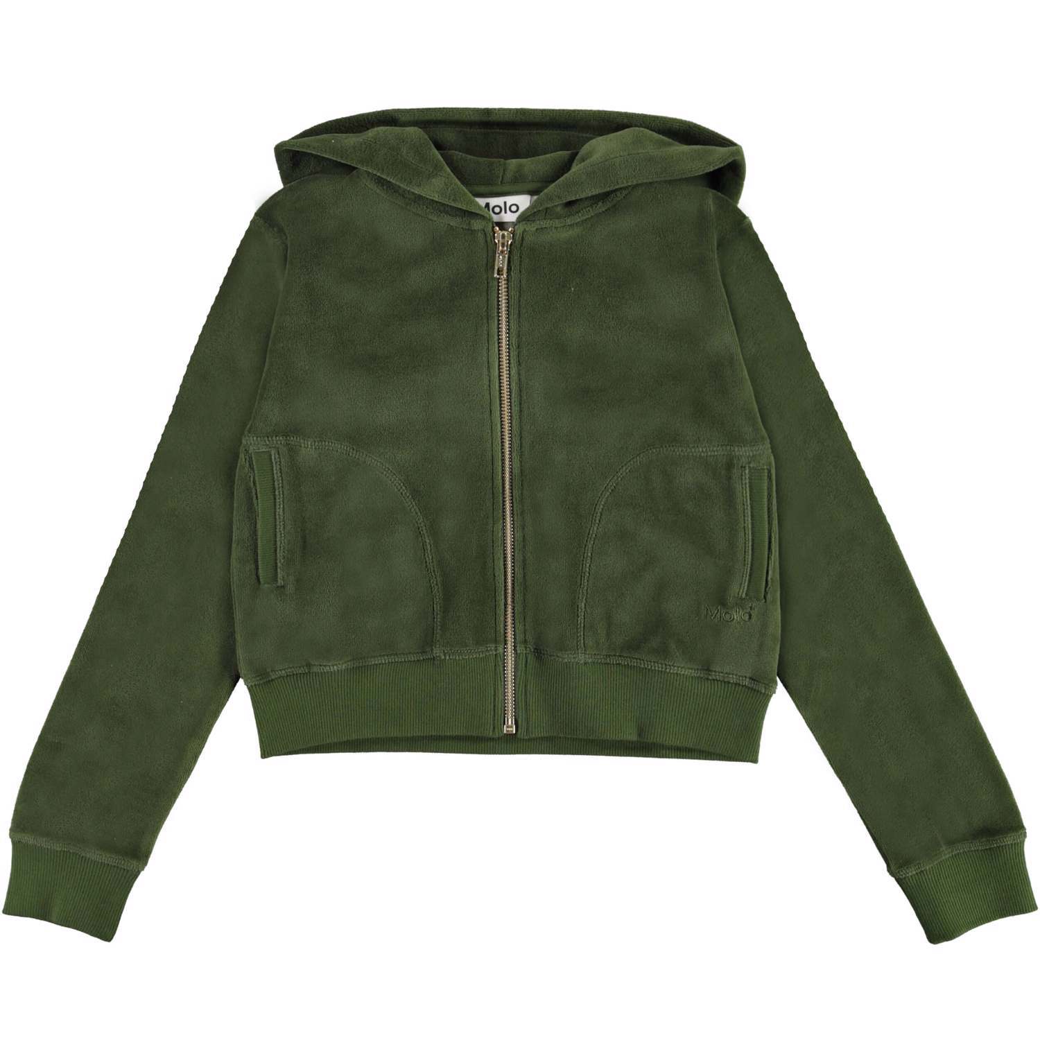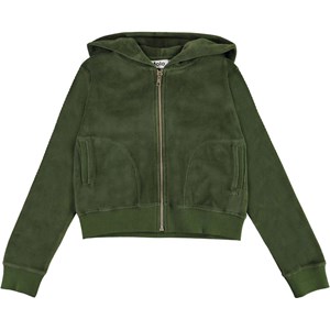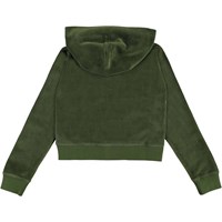 Milla är en grön velour luvtröja med dragkedja och fickor framtill. Kombinera tröjan med matchande byxor.