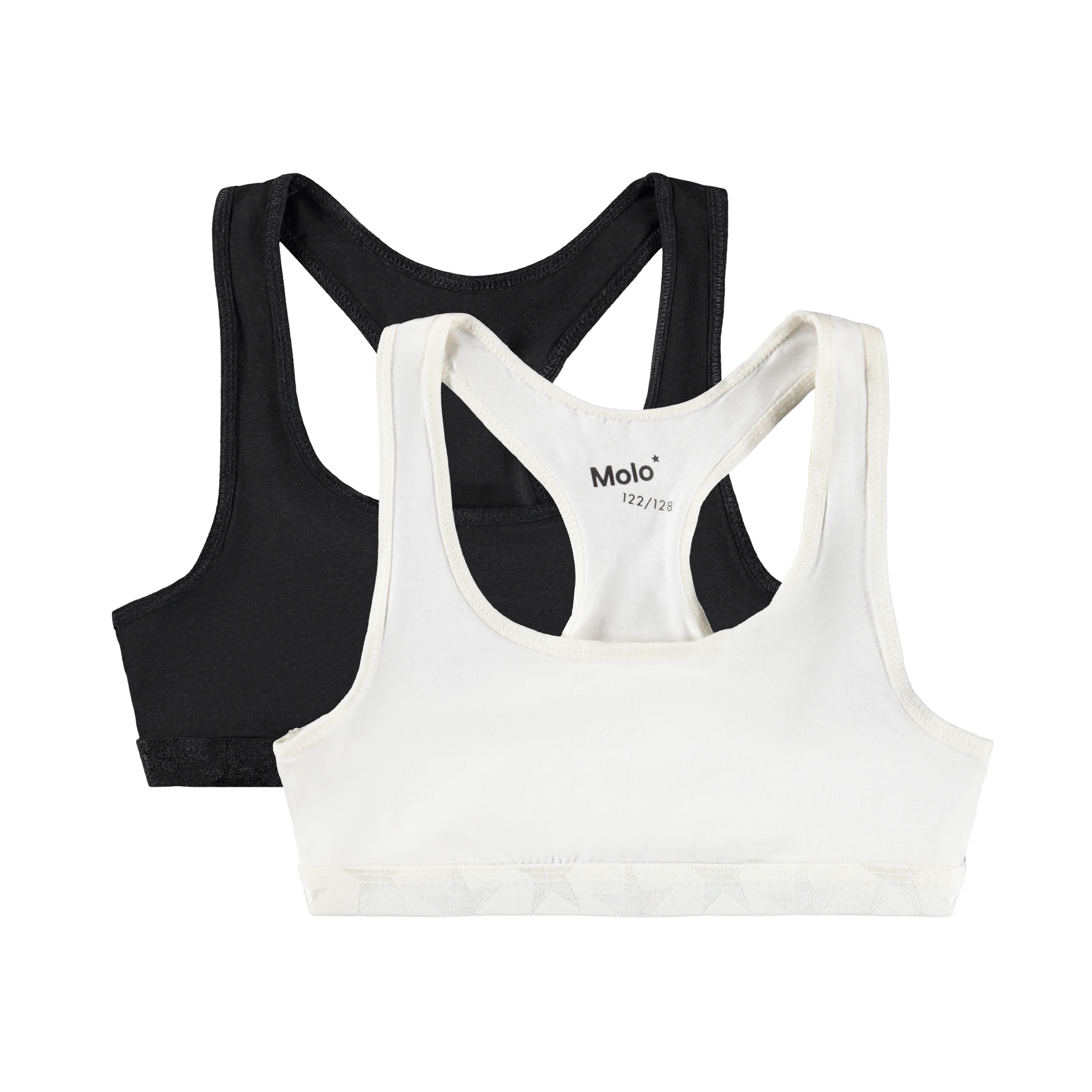 Sportig topp med brottarrygg och gummiband nertill med stjärnor, som säkrar att toppen sitter bra.Här är Jade i ett 2-pack med en svart och en vit topp. De kommer i en liten tygpåse.