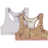 Sportig topp med brottarrygg och gummiband med stjärnor nertill, som säkrar att toppen sitter bra. Här är Jade i ett 2-pack med en ljuslila och en rosa med blomsterrankor. Underkläderna kommer i en liten tygpåse.