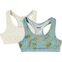Vårt 2-pack populära toppar, här med en råvit och en blå med blommigt mönster. Den mönstrade är med de finaste gula mimosa blomsterrankorna. De är tillverkade i 100% bomullsjersey med stretch, vilket gör dem mjuka och sköna att ha på och enkla att röra sig i. Matcha ev. detta 2-pack med vårt Jana 2-pack som innehåller matchande trosor.