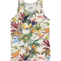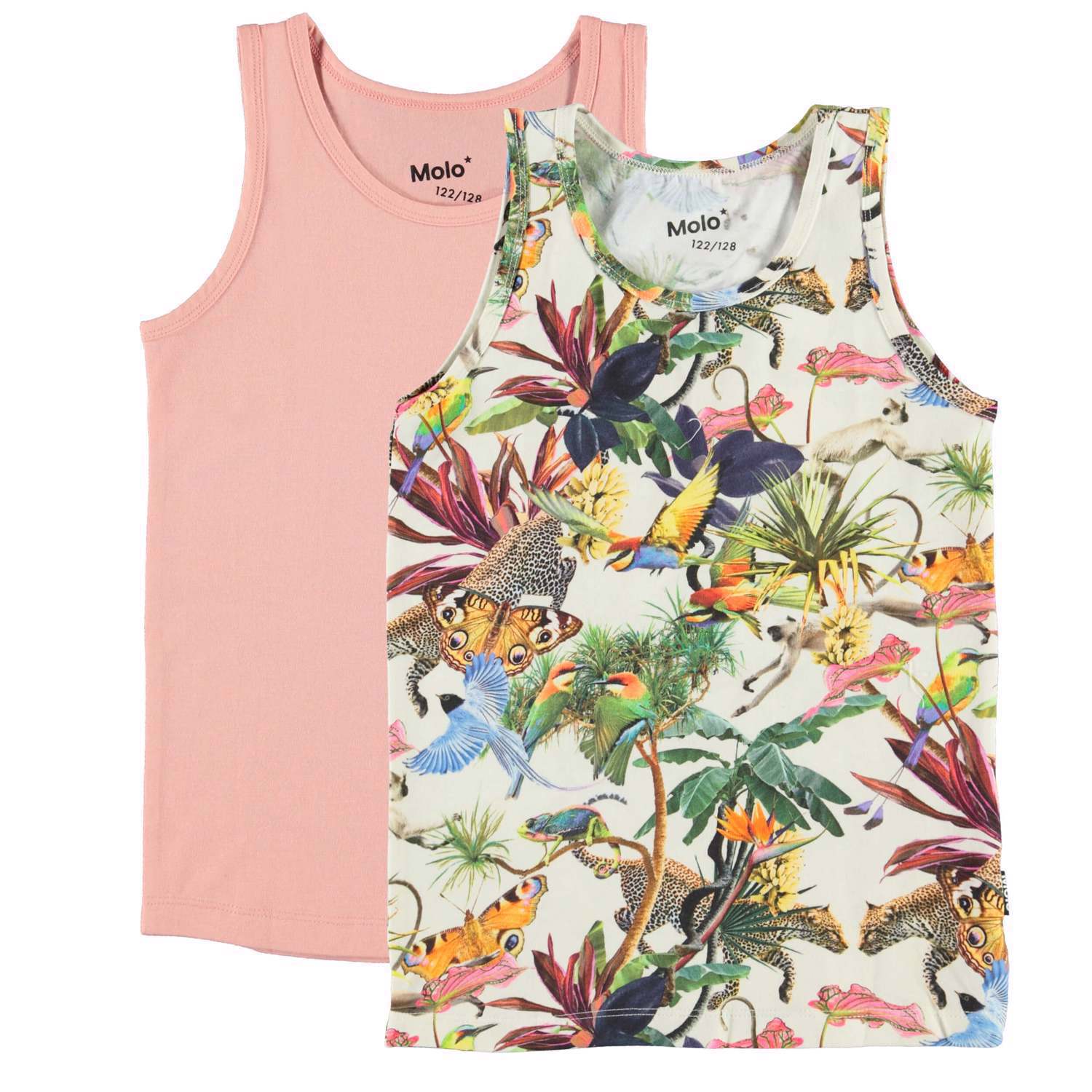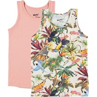 2-pack undertröjor med breda axelband. Den ena i rosa och den andra med blommor och djungelns djur.