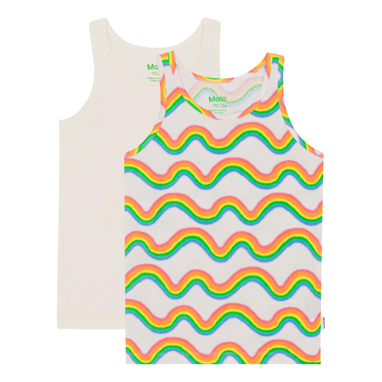 2-pack linnen i mjuk ekologisk bomull. Linnena har breda axelband och är sköna att ha på i den mjuka stretchiga bomullen. Linnena är olika, det ena är vitt och det andra med Molos regnbågar. Kombinera med matchande trosor och få ett komplett set.