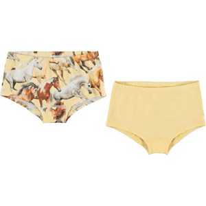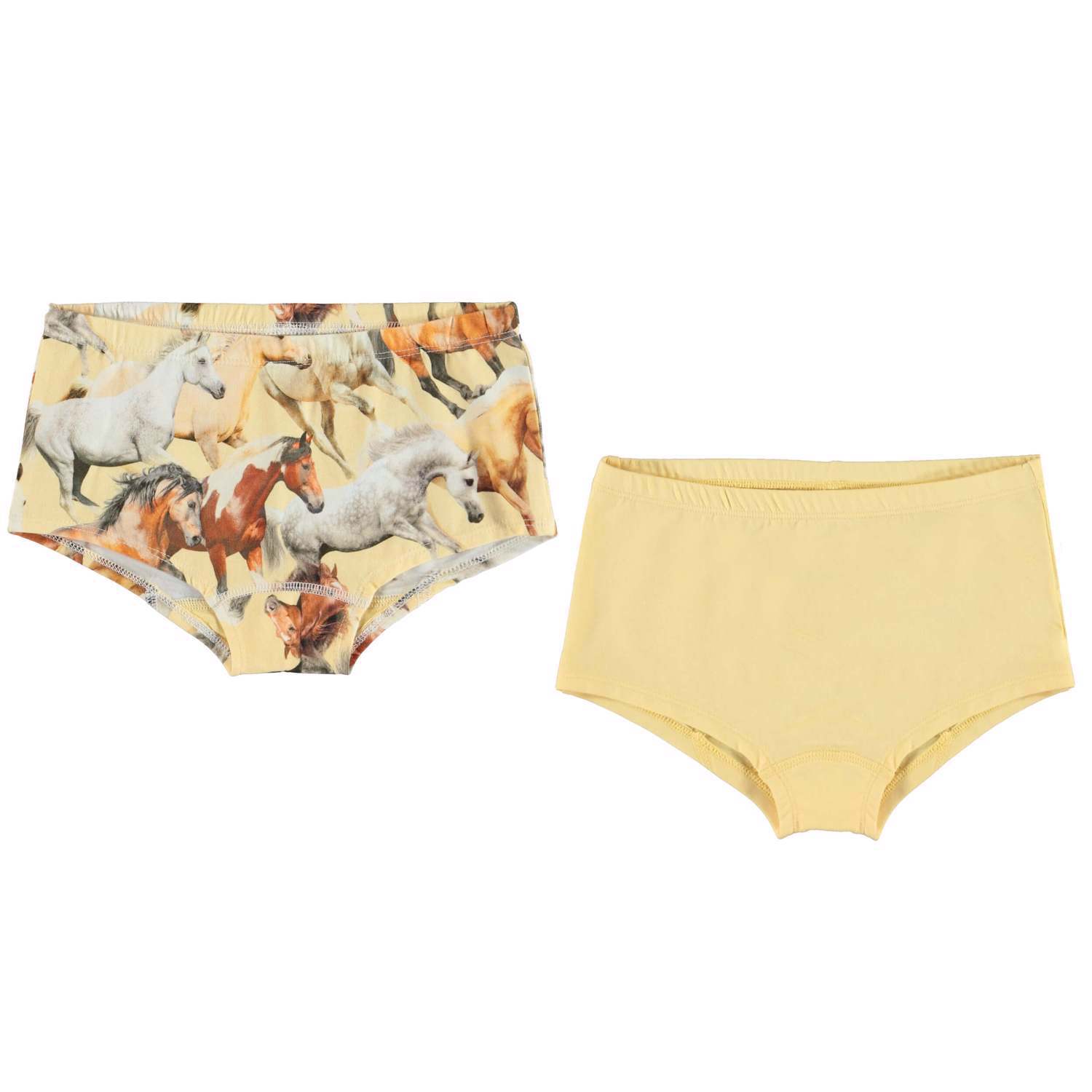 2-pack trosor med bred passform. Det ena paret i gul och det andra med hästar.
