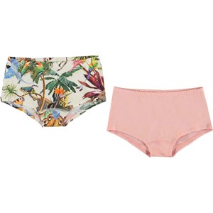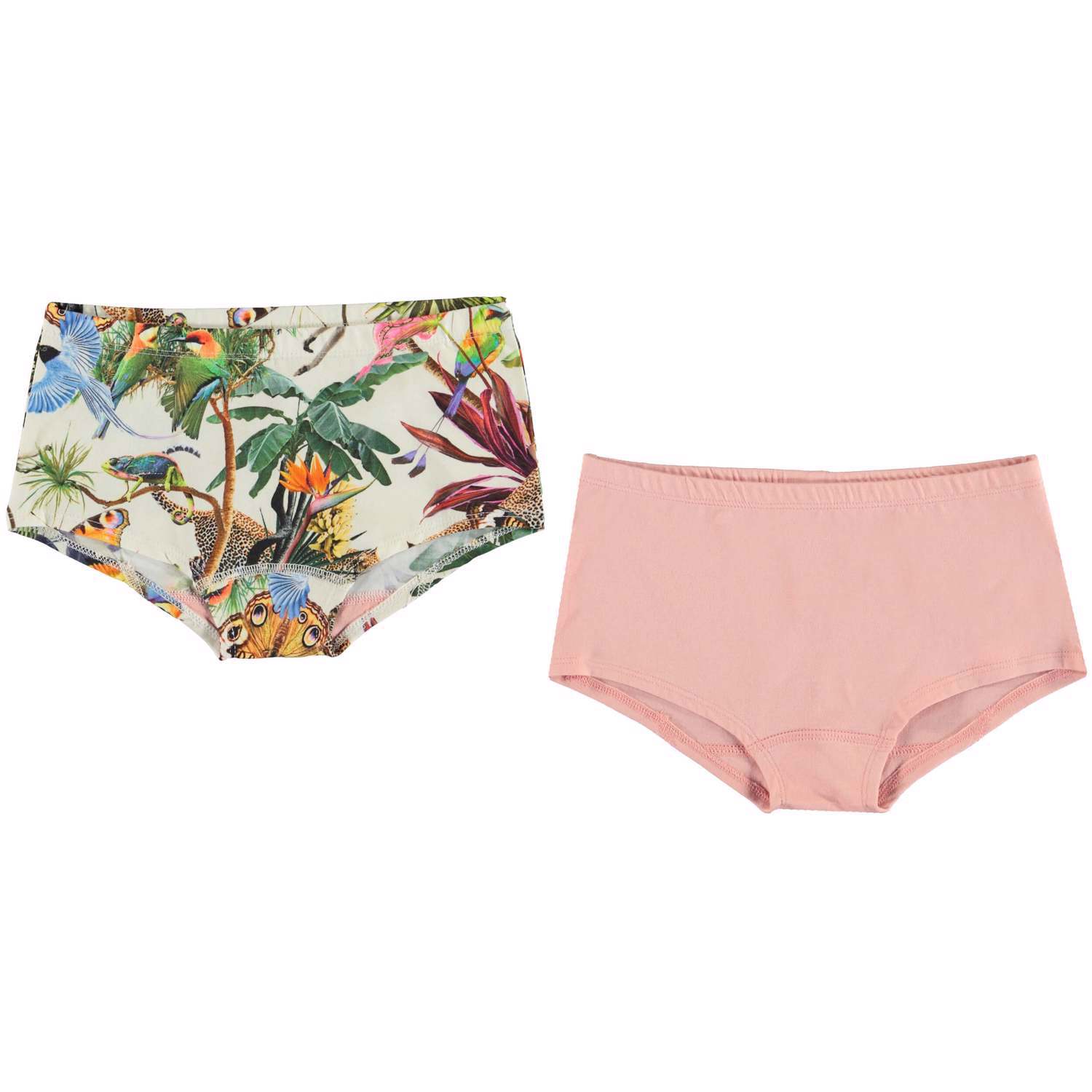 2-pack trosor med bred passform. Det ena paret i rosa och det andra med blommor och djungelns djur.