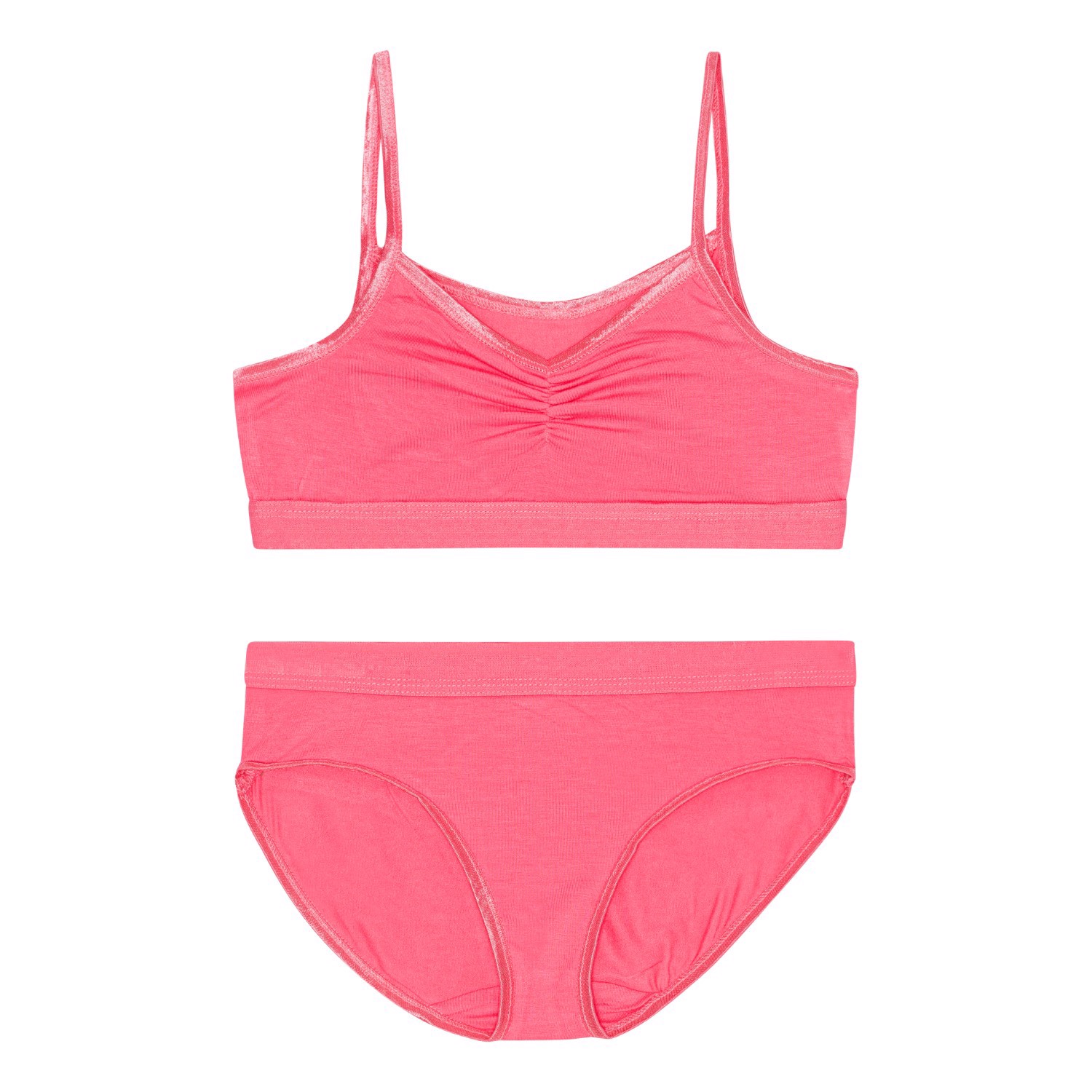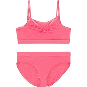Rosa mjukt och stretchigt underklädesset. Toppnen har tunna axelband och en rynkad söm framtill som ger ett fint snitt. Både topp och trosa har en bred elastisk kant som säkrar en bra passform och gör dem sköna att ha på.