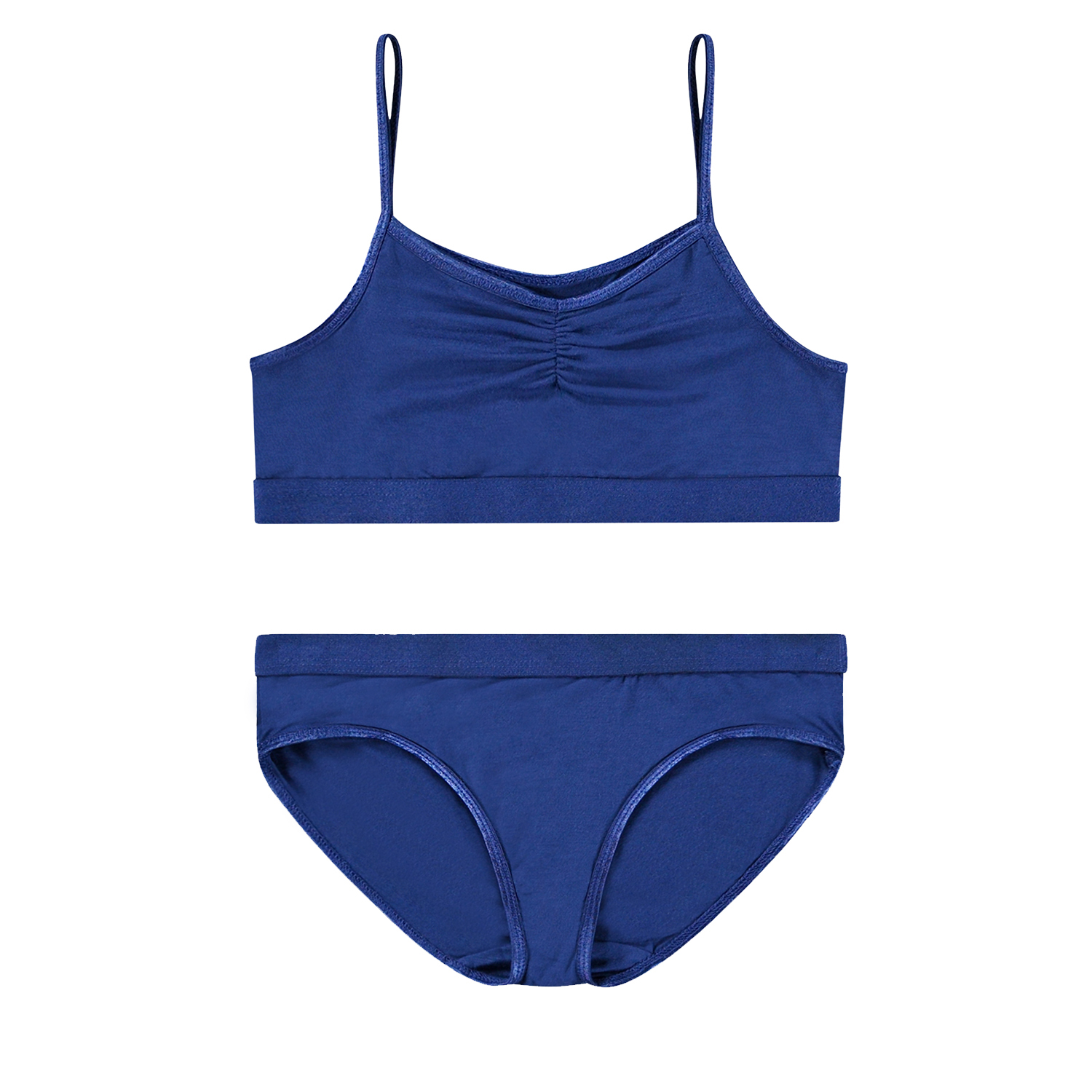 Marinblå stretchiga underkläder tillverkade av mjuk viskos. Toppen har tunna elastiska band och en samlad söm fram, vilket ger toppen en fin passform. Både toppen och underdelen har ett gummielastiskt band, vilket garanterar en bra passform och gör det skönt att ha på.