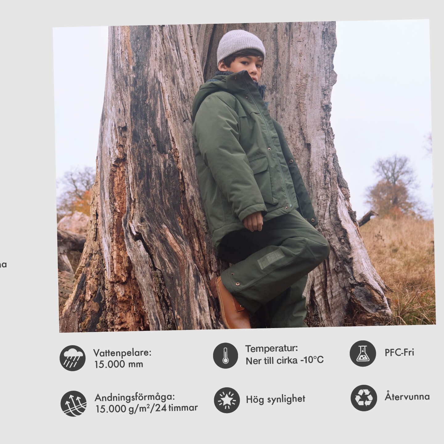 • Ytterplagget har en hög andningsfärmåga vilket förhindrar att kondensering och fukt samlar sig i plagget, även när barnet är fysiskt aktivt.