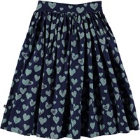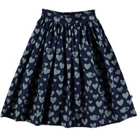 Brittany är en medi kjol i poplin med massa av kärlek, i form av hjärttryck. Trycket 'Blue Love' är i blå nyanser och kjolen har dragkedja i sidan.
