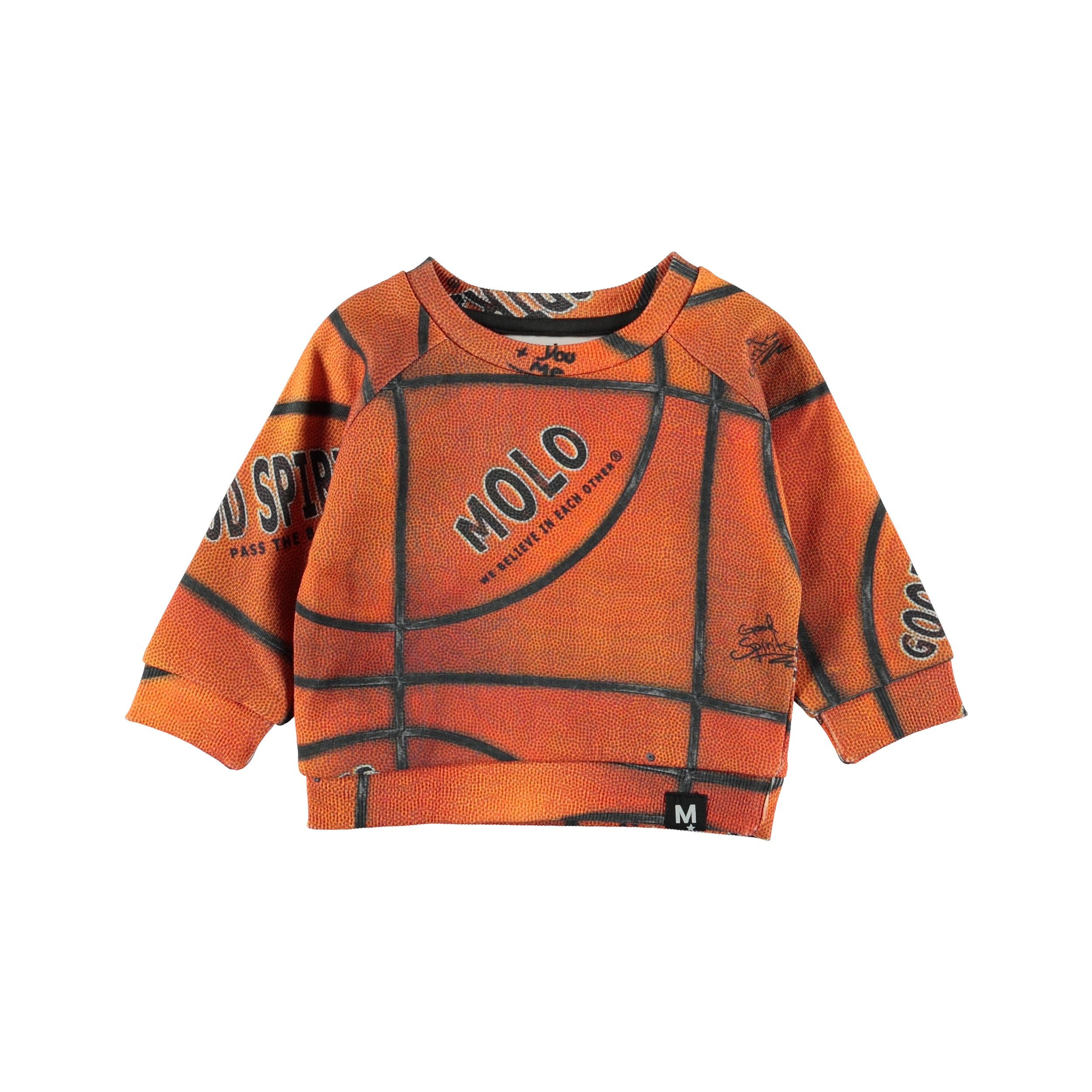 Dag är en baby sweatshirt med basketbollens struktur, som orangefärgat tryck på blusen.