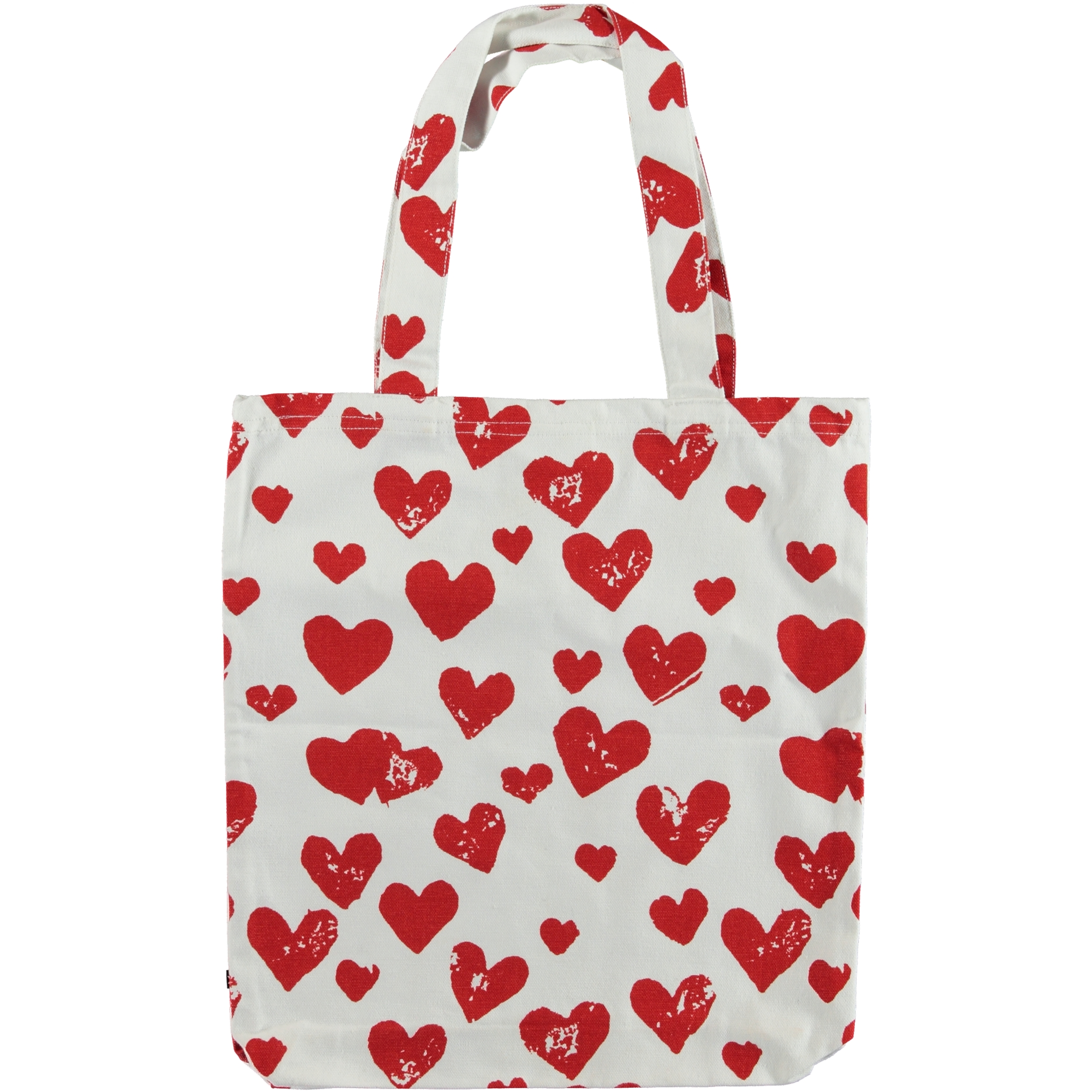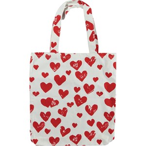 Små röda hjärtan är spridda över den vita totebagen, som utstrålar kärlek.