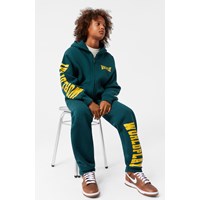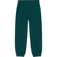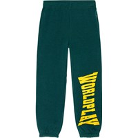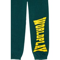 Gröna sweatpants i ekologisk bomull med gummiband i midjan, invändigt band, resår i bensluten och sidofickor. Byxorna har en normal passform och en tryck av texten "WorldPlay" i ljusgul. Byxorna har en borstad insida, vilket gör dem mjuka och varma att ha på.