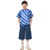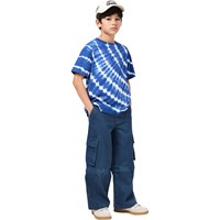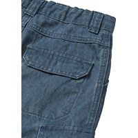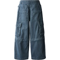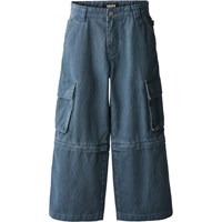 Zip-off cargobyxor i blå bomullsdenim med lös passform. Byxorna har sidfickor, bakfickor och cargofickor samt en justerbar elastisk midja. Den nedre delen kan zippas av, vilket förvandlar byxorna till shorts. De minsta storlekarna (92–134) har en tryckknapp, medan storlekarna 140–176 har en klassisk jeansknapp.