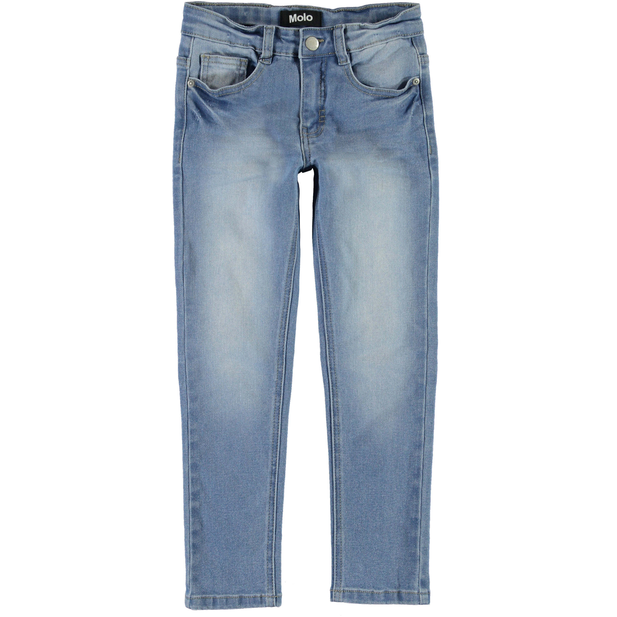Aksel är ett par smala, ljusblå jeans. Byxorna har lite stretch. Observera att storlekar till och med 134 har en tryckknapp och ingen vanlig jeansknapp.