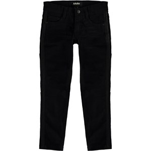 Aksel är svarta 'Holiday' jeans i denim med en slim fit och svart band i sidorna. Aksel är en del av Molo's 'Holiday' kollektion. Var uppmärksam på att storlekarna upp till och med 134 har tryckknapp och inte vanlig jeansknapp.