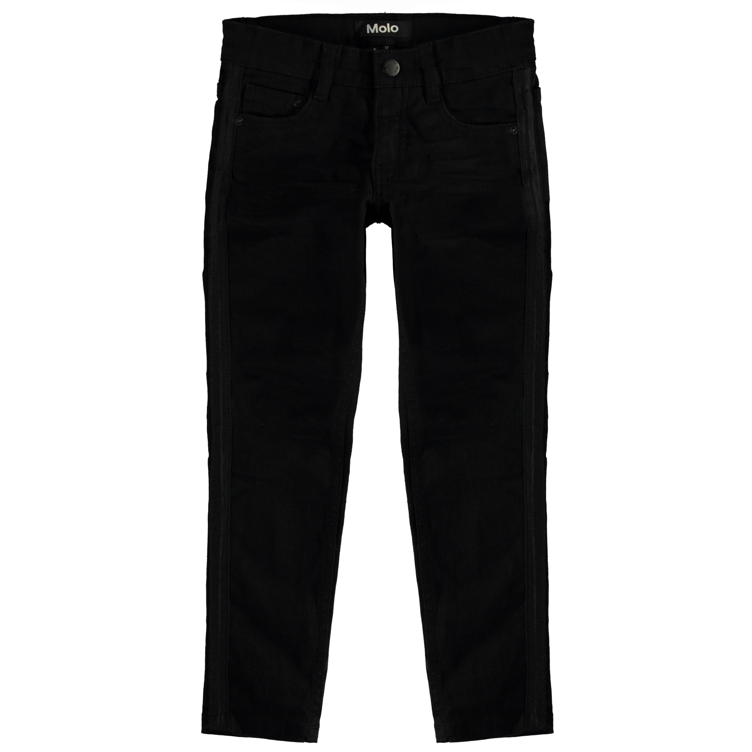 Aksel är svarta 'Holiday' jeans i denim med en slim fit och svart band i sidorna. Aksel är en del av Molo's 'Holiday' kollektion. Var uppmärksam på att storlekarna upp till och med 134 har tryckknapp och inte vanlig jeansknapp.