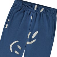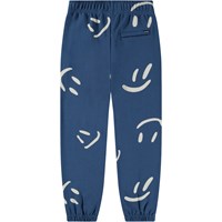 Ekologiska bomulls sweatpants. Byxorna har en justerbar elastisk midja, sidofickor, en enkel bakficka, elastiska benslut och en vanlig passform. De är blåa med ett tryck av smilys. För en komplett outfit, matcha med en matchande sweatshirt.