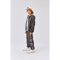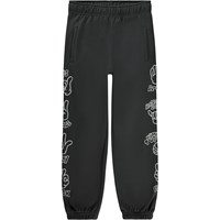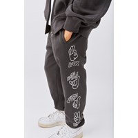 Allen är ett par lösa sweatpants i mörkgrå. Byxorna har gummiband i midjan och nertill i benen. Allen har fickor i sidorna, en enkel bakficka och coola handtecken ner längs sidorna.