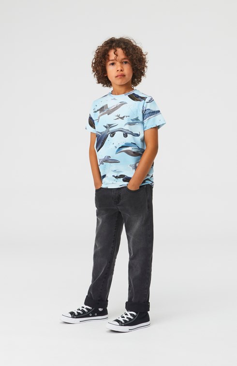 Alon är ett par svarta jeans i en regular fit med en cool passform. Midjan går att justera med ett band i midjan, så att de passar utmärkt till alla barn. Uppmärksamma att storlekar till och med 134 har tryckknappar istället för vanliga jeans-knappar.
