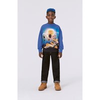 Mörka jeans i en svart tvätt och kopparfärgade sömmar. Dessa jeans är tilverkade i 100% bomull, har fickor i sidorna, bakfickor och en normal passform. Byxornas midja kan justeras med invändigt gummiband, så de passar perfekt till alla barn. Storlek 92-134 har tryckknapp för att göra dem enkla att ta av och på. Storlek 140-176 har vanlig jeansknapp.