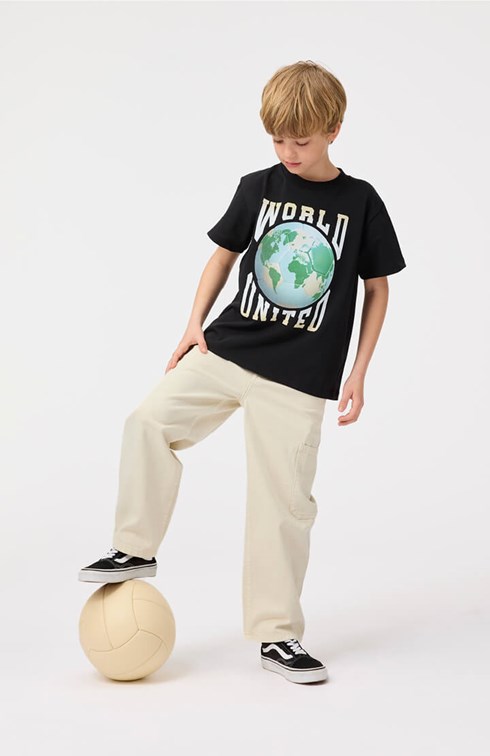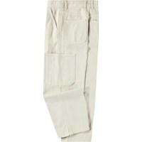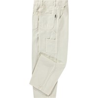 Vita bomullsjeans med arbetsklädseldetaljer. Jeansen är praktiska och har många fickor, både på sidorna längs benen. De har en lös passform och kan justeras i midjan med ett invändigt gumiband, så de passar perfekt för alla barn. Storlekarna 92-134 har tryckknappar för enkel på- och avklädning, medan storlekarna 140-176 har en vanlig jeansknapp.