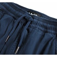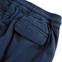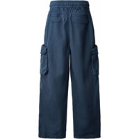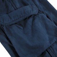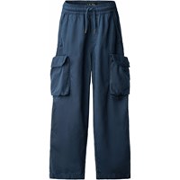 Blå cargobyxor i ekologisk bomull med resår i midjan, invändig dragsko och en normal passform. Byxorna har bakfickor, sidofickor och en ficka på varje lår.