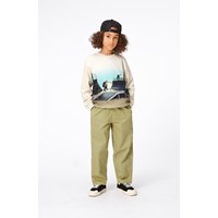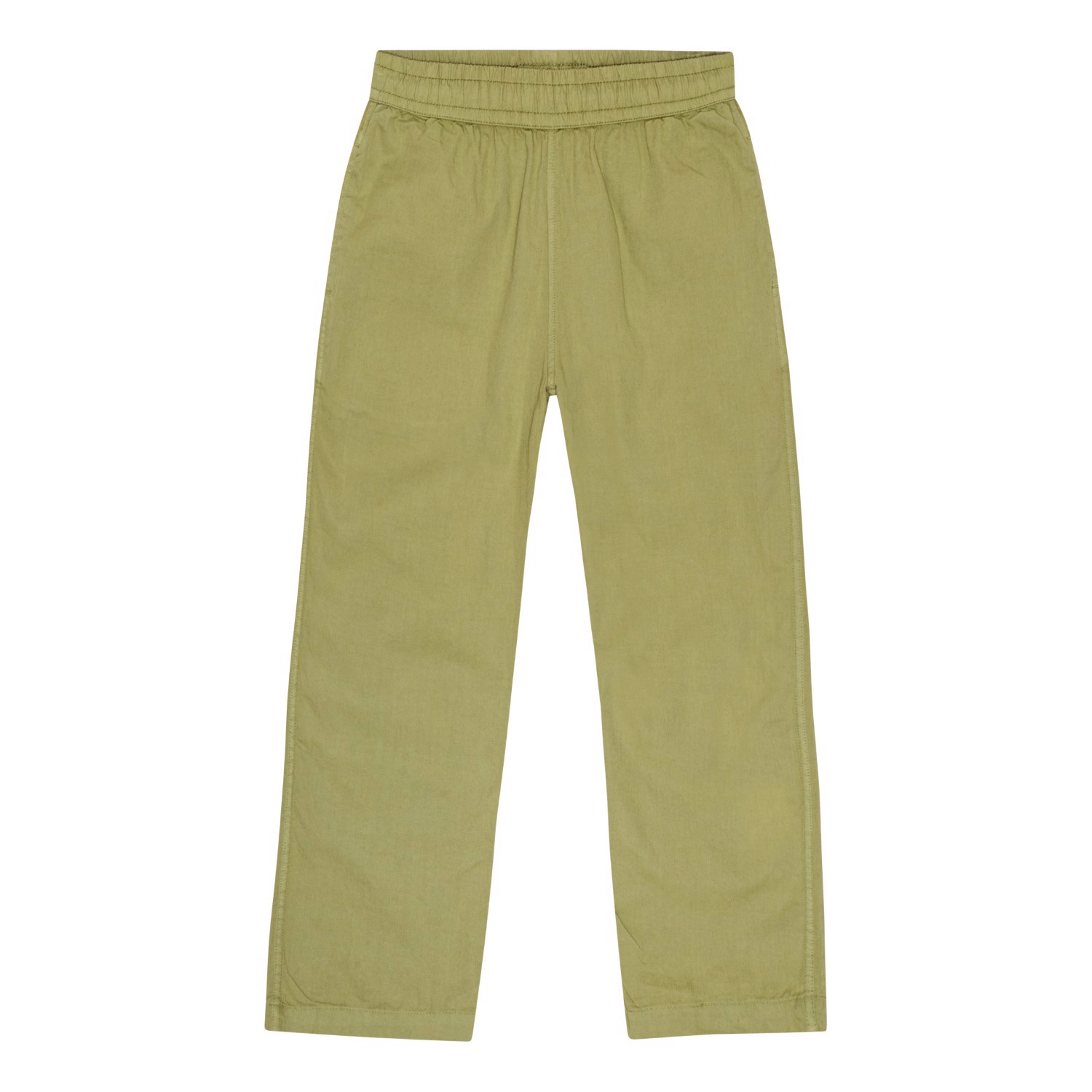 Lätta mossgröna byxor i 100% ekologisk bomullskvalitet. Dessa byxor har fickor i sidorna, bakfickor och gummiband med invändigt knytband i midjan som gör att de sitter bra hela dagen och är sköna att ha på. Aster har en normal passform.