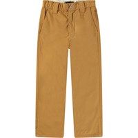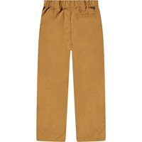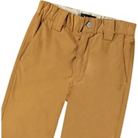 Bruna chinos i ekologisk bomull. Dessa byxor har en elastisk midja, knappstängning, tre fickor, breda bältesöglor och en normal passform.